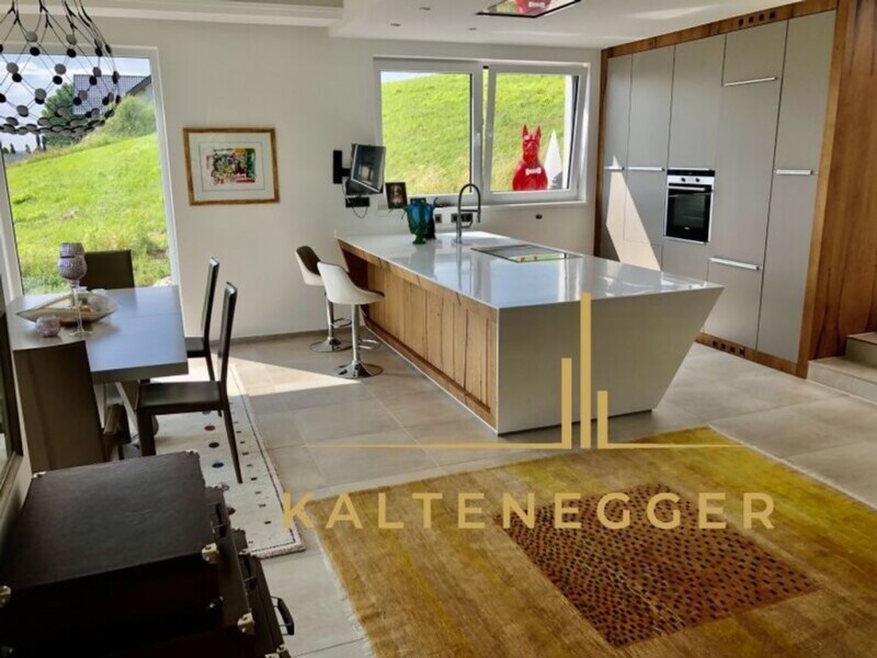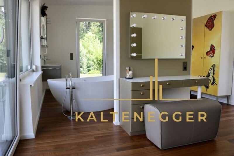 This modern house with approx. 240 m² of living space, a 50 m² living cellar and a double garage (approx. 56 m²) is located in an absolutely quiet location, bordering on grassland. The property is in new condition as it was first built. Of course, the property has been fitted out to a high standard: Wienerberger thermal insulation tiles, pent roof, anthracite-colored plastic windows with external blinds, underfloor heating via geothermal energy, water cistern, 10 internet connections, satellite system in every room, alarm system with video surveillance. Two kitchens, an additional utility kitchen and two possible living units offer a lot of flexibility. The attention to detail is unmistakable. The 1,520 m² plot and the room height of over 3 m in some places create an exclusive living experience. The same goes for the large windows, which bring the green surroundings, such as forests and meadows, into the house. Note according to the Energy Certificate Submission Act: An energy certificate has not yet been submitted by the owner or seller, after we informed them of the general obligation to submit it and requested that it be created. Therefore, at least an overall energy efficiency corresponding to the age and type of the building is deemed to have been agreed. We assume no liability or guarantee for the actual energy efficiency of the property on offer. Perg.