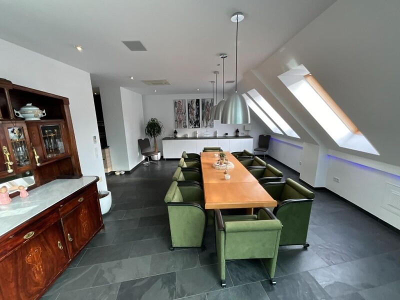 A spacious penthouse is for sale in Vienna's 3rd district, right next to the Rennweg S-Bahn station, in the middle of the diplomatic quarter. The penthouse on 2 levels, with an area of almost 334 m2, also includes Top 11 on the ground floor (approx. 70 m2) - a former business premises, where there is currently a storage room or a garage for max. 6 cars. The elevator takes you directly into the apartment. In addition to the elevator, the apartment can also be accessed via an armored safe door in a bank look. A curved staircase leads to the entrance area or the 1st attic floor of the apartment. From there you can access: - the high-quality equipped kitchen (approx. 22 m2) with NEFF appliances and 2 cold storage rooms (approx. 2.5 m2 each); - an anteroom or meeting room with an area of approx. 57 m2; - a living room with approx. 76 m2, beautifully and comfortably furnished with a fireplace, a bar and seating area; - SPA area (approx. 41 m2) with bathroom (sink, shower), Finnish sauna, steam bath, relaxation room; - separate toilet (with toilet, bidet, urinal, washbasin); - and the exit to the terrace (approx. 51 m2) and the atrium. The curved staircase or the elevator lead to the 2nd top floor of the penthouse, where the family's bedrooms and private rooms are located. In the upper area there is a workstation for the master of the house, with a view over the rooftops of Vienna. To the left of the office is the guest or children's room (approx. 28 m2) with an adjoining bathroom with shower, washbasin and toilet (approx. 10 m2) and a walk-in wardrobe. To the right of the office you go through the wardrobe (with safe) into the master bedroom (approx. 39 m2) with an adjoining spacious bathroom (approx. 26 m2), equipped with a bathtub, 2 washbasins, shower, toilet and bidet. From the master bedroom you can also access the two upper terraces: the wooden terrace of approx. 28 m2 and another terrace of approx. 50 m2. The apartment is being sold with all furniture. The running costs are approx. € 1,200 per month. We look forward to your inquiry and would be happy to organize a viewing!.