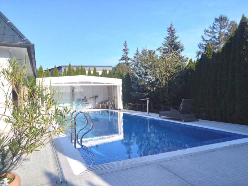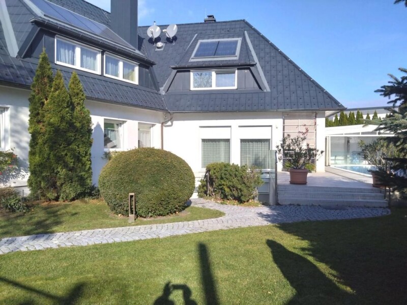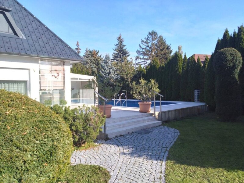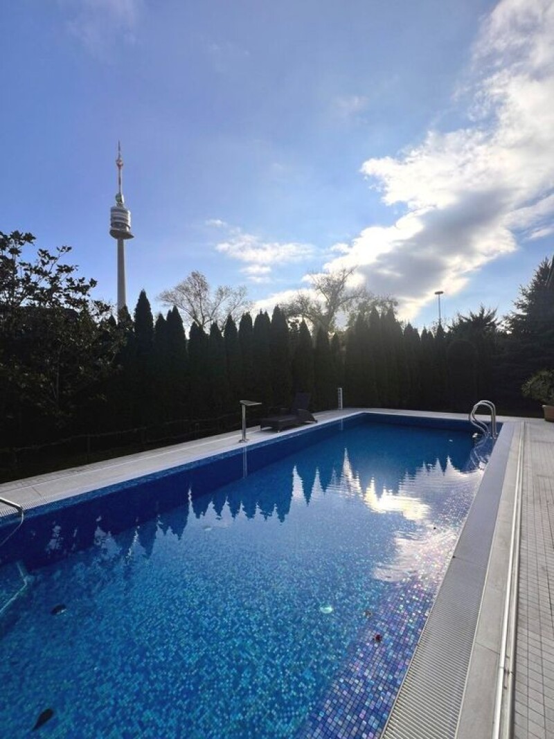 Perfect house in Bruckhaufen, near Donaupark, UNO City and Vienna International School! This modern house offers plenty of space and quality of life. It has a 49 m² living room with fireplace and direct access to the terrace and the heated pool and garden. On the ground floor there is also a bedroom with en-suite bathroom, a spacious office, a kitchen-diner with separate utility room and a guest toilet. The room height is 2.8 m. On the 1st floor there are 3 bedrooms, 3 bathrooms and 2 cloakrooms. In the basement there is a garage, a wine cellar, a wine tasting room, a sauna with direct access to the Alpinum, a workshop and technical rooms. There is space for one car in the garage, and in front of the garage there is a covered parking space for one or two cars. In front of the house there is also space for up to three cars. The plot is just over 1000 m², of which 255 m² are built. It is a solid brick house that was built in the 1970s and was completely renovated to a high standard in 2014/15. Highlights of the house include: GIRA house bus system (app) Alarm system (app) Video surveillance system with server (app) Intercom system Heat control system (app) Solar system Air conditioning Daikin Ceiling cooling (app) Triple glazing Parquet floors Fountain for automatic irrigation Heated pool (massage jet) Sauna Solid wood wardrobes Wine cellar Fireplace Grill area For further information, please contact Dr. Schlosser on +43 650 7791 551 or 01/ 479 1558/213. Isolated location, green view, green location, pool, cul-de-sac, sunny.