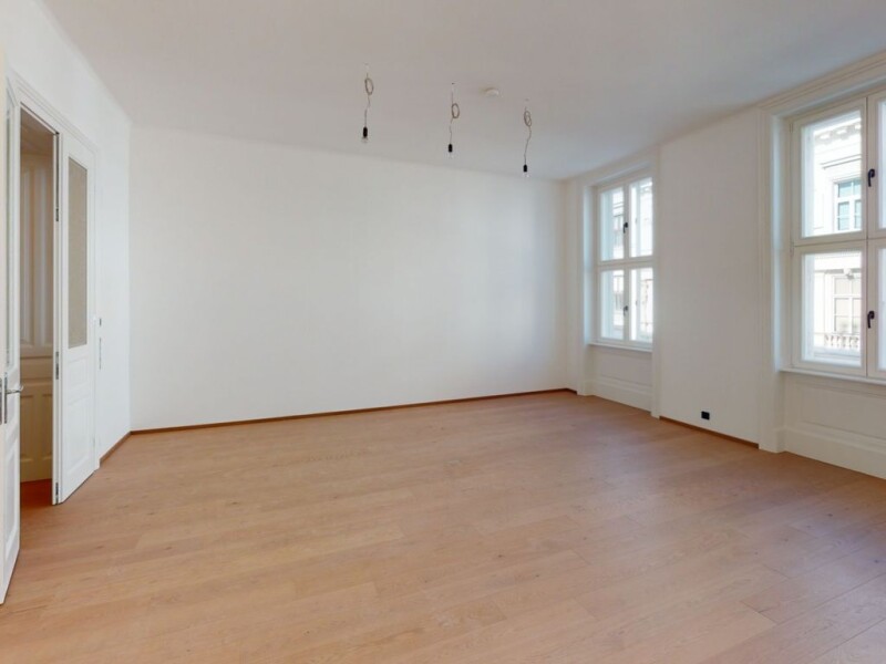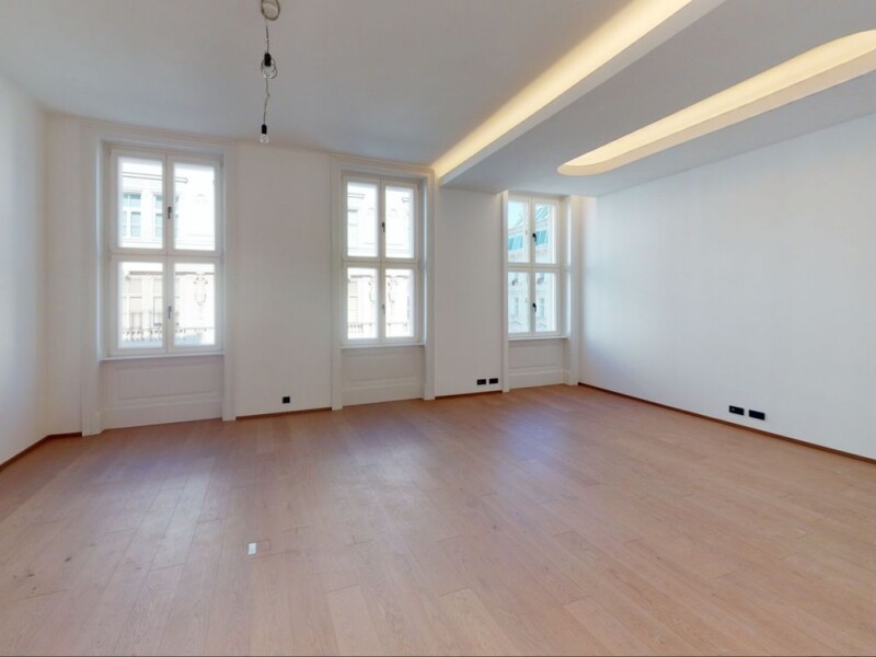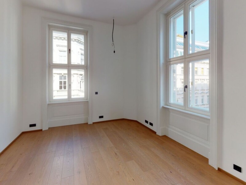 Fully renovated old-style apartment for sale in a neat corner building in the 1st district of Vienna - Textilviertel. Situated on the 3rd floor of the elevator, this splendid south-east facing apartment opens up to a spacious living / dining area with great layout of rooms, divided into a private area with 3 bedrooms and 2 bathrooms, one of which is en suite. The apartment is equipped with underfloor heating oak parquet, double glazed windows, bathrooms and a toilet are tastefully decorated with large-format porcelain stoneware.