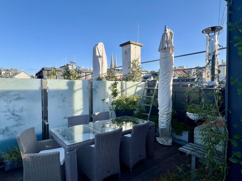 For sale: A beautiful, modern apartment with a 30 m² terrace in a fully renovated classic Viennese period building in a prime location. This bright and sunny penthouse apartment offers approx. 86 m² of living space and features a foyer, a living kitchen, a bedroom, a study/children’s room, a bathroom, and a separate WC. The bathroom is equipped with high-quality fittings, and a fully furnished, nearly new kitchen with all appliances is included.