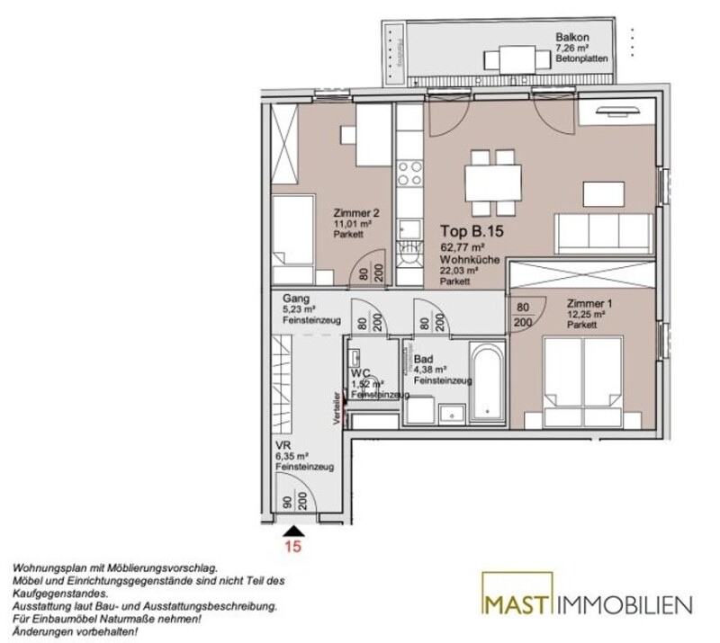 NO COMMISSION for the buyer! You can find all available apartments on our homepage: www.mast-immo.at "An der Schanze 25" - your new home, investment and pension The impressive and exclusive project is located in the "Quartier Donaufeld" in the popular 21st district of Vienna and represents a unique building complex made up of four parts with a total of 212 exclusively furnished apartments. 58 apartments in part A, 45 apartments in part B and 64 apartments in part D are for sale. OWN LAND! - NO LEASE! The expected completion is planned for the end of 2026. Highlights of the property: Nature-related facade design that blends perfectly into the surroundings Direct access to the Old Danube via the natural green belt that borders the building area Real wood floors Ceramic tile flooring in the wet rooms Triple-glazed plastic windows with aluminum cover Locking system Passenger lift Underground car park Connections for air conditioning units in all residential units Heating and temperature control via component activation Each apartment with open space Location: Goodbye car If you don't have a vehicle, that's no problem at this address. Numerous local suppliers, everyday items and even the popular Danube Center with over 262 shops, restaurants and a cinema are in the immediate vicinity of the property. On hot summer days, the Old Danube, connected by a green strip, is an inviting place to linger! Details of apartment component B Top 15: The apartment is on the 2nd floor with elevator and has 62.77 m² of living space + a 7.26 m² balcony. The apartment is divided as follows: Kitchen-living room approx. 22.03 m² Bedroom approx. 11.01 m² Bedroom approx. 12.25 m² Balcony approx. 7.26 m² Entrance hall approx. 6.35 m² Bathroom approx. 4.38 m² Separate toilet approx. 1.52 m² Hall approx. 5.23 m² The purchase price for investors is €383,000 net plus 20% VAT. An underground parking space can be purchased for €30,000 for owner-occupiers or €27,500 net plus 20% VAT for investors. On our homepage you will find an overview of all available 3-room apartments and further details. We would like to point out that there is a close family or business relationship between the agent and the third party to be brokered. The agent acts as a double broker. Infrastructure / Distances Health Doctor <750m Pharmacy <750m Clinic <2,000m Hospital <2,500m Children & Schools School <750m Kindergarten <750m University <1,250m High school <1,750m Local amenities Supermarket <750m Bakery <1,000m Shopping center <1,250m Other ATM <1,250m Bank <1,250m Post office <1,250m Police <750m Traffic Bus <750m Subway <1,250m Tram <750m Train station <1,250m Motorway junction <1,750m Information Distance as the crow flies / Source: OpenStreetMap.