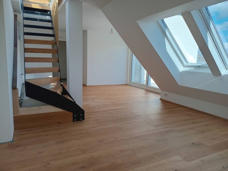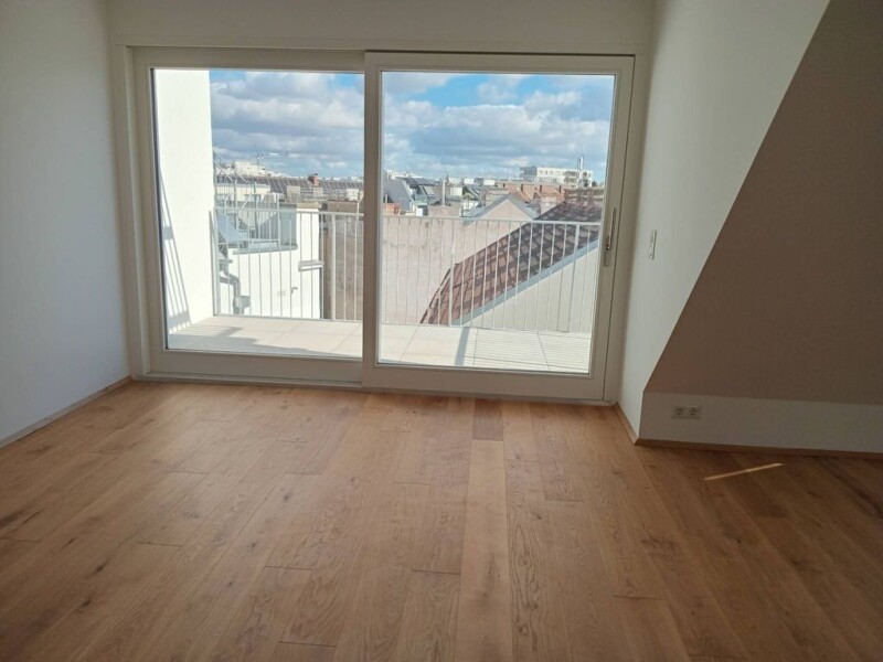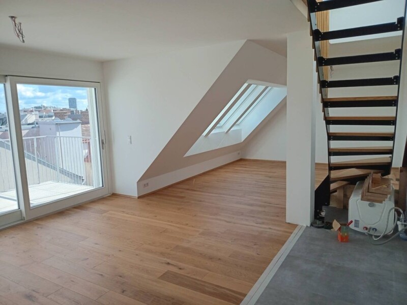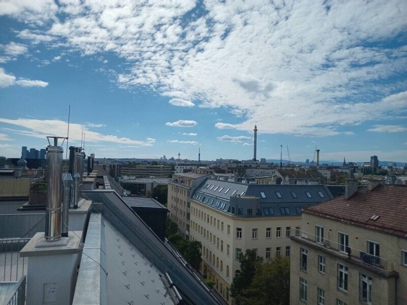 This light-filled, 2-room penthouse apartment offers comfort and an exclusive living experience across approximately 74 m² of refined living space. An east-facing balcony, along with the crowning feature—a spacious rooftop terrace soaring above the rooftops of Vienna—provides breathtaking panoramic views of the Prater, the Giant Ferris Wheel, and St. Stephen's Cathedral, perfect for unforgettable moments. The apartment's modern floor plan and harmonious design impress with bright, welcoming rooms that create an inviting atmosphere. The open-concept kitchen seamlessly blends culinary enjoyment with socializing, making it ideal for cozy evenings with family and friends. Built with sustainable and robust timber and steel, this property is equipped with external shading, a shared photovoltaic system, and a heat pump for heating, ensuring eco-friendly and comfortable living.