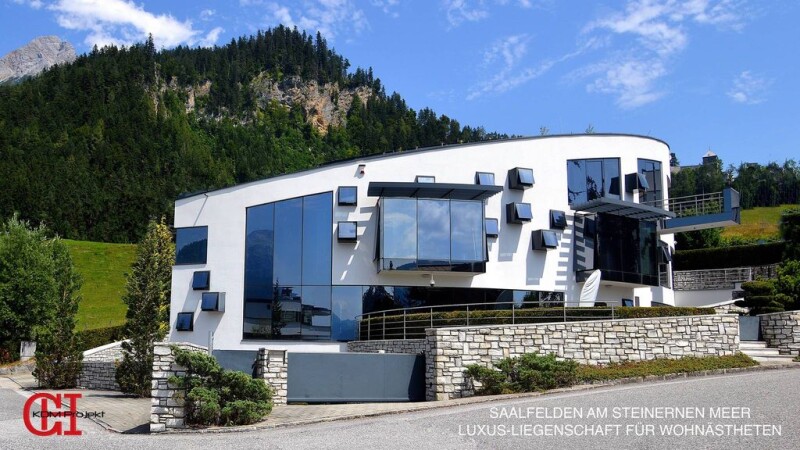 Refined and clear, powerful and filigree, elegant and rugged: this spectacular villa thrives on apparent contradictions. It is precisely this field of tension that explains the breathtaking effect, the unique radiance and the magic of this property. Only with a very clear vision can it be possible to transform a building such as a luxury yacht into a residence that fascinates with its abundance of light and transparency, magnificent lines of sight and breathtaking panoramic views of the Steinernes Meer all the way to the Kitzsteinhorn. With this goal in mind, the pioneering, committed owner worked hand in hand with the ingenious architect. In addition to top-class aesthetics, maximum comfort and exclusive furnishings with valuable materials and the latest technology, this property in a privileged location offers safety standards that are hard to beat. An abundance of light, spaciousness and a stylish ambience characterize this top-class, absolutely new villa. The intelligent floor plan perfectly divides living, sleeping and wellness. In addition to comfortable stairs, a convenient elevator connects the floors. In the basement, next to the garage, there is the foyer with adjoining pool area, as well as a separate, spacious apartment, utility and technical rooms. Two guest parking spaces have been created directly in front of the entrance area. On the second level, everything is focused on living, cooking and eating, complemented by spacious terraces. The exquisite designer kitchen leaves nothing to be desired - it is extended by a practical pantry with luxury appliances. The absolute highlight is the spectacular air space with a fascinating fireplace and high glass facade. The inviting guest area with four double bedrooms, en-suite bathrooms and its own terrace takes up the entire third level. The last floor is dedicated to the owner's private area - with a master bedroom, master bathroom en-suite, dressing room and walk-in safe. Two balconies complete the offer on this level. The entire interior is dominated by exquisite fittings made of cherry wood and black high-gloss varnish as well as exclusive upholstered furniture made of the finest leather. Large-format porcelain stoneware tiles, elegant mosaics in the pool and bathroom area, as well as numerous stainless steel elements underline the puristic look of the entire property. The luxury property is being sold with the complete, exclusive inventory (included in the purchase price). Available immediately. You can find an informative video on our homepage. Equipment: above-average room heights, large-format grey porcelain stoneware, custom-made, extra-high ethanol steel fireplace, open carpenter-made fitted kitchen: cooking/work island with integrated, extendable extractor hood, induction hob, refrigerator, dishwasher, oven, steamer, warming drawer and fully automatic coffee machine with cup warmer, pantry with XXL freezer and XXL wine fridge, service cupboard with coffee machine, sink, dishwasher and fridge on the guest floor and in the master area on the 4th floor, windows, outside panes (wall/roof) and floor panes made of laminated safety glass: outside panes filled with argon gas, heat-insulating glass on the inside, sun-protecting glass on the outside, windows with lotus coating on the outside, all windows have a rain sensor and are operated electrically individually or together, stainless steel Thyssen elevator over 4 floors for 8 people and 600 kg load capacity, carpenter-made fitted furniture throughout the house made of cherry wood with black high-gloss varnish, seating sets and 34 armchairs (Rolf Benz) made of lightfast special leather Carpenter-made, solid interior doors (white) Walk-in safe, resistance class I Automatic living room ventilation with 3 levels Geothermal heat pump Alarm system in all rooms, separate apartment can be switched on separately All curtains and mattresses are electrically controlled Lighting in the entire house can be dimmed and switched on via the bus system Front doors, connecting door garage/apartment and entrance door to the master bedroom are security doors with motor locks that are opened using a transponder Surface heating and cooling (floor, wall, ceiling) in every room, separately controllable Bose outdoor loudspeaker Outdoor camera Electric entrance gate The entire driveway, 4 outside visitor parking spaces and the walkways on the terraces can be heated individually or together to keep the areas free of snow in winter Wall computer in the living area to control all functions in and outside the entire property (control via computer, iPad, iPhone) Easy-care exterior walls with synthetic resin coating and granite cladding Wellness area: Indoor pool (BWT) with approval for thermal baths Fully automatic filter and Dosing system Countercurrent system 4 massage jets Underwater spotlights, water feature with lighting (6 colors) Bose music system with remote control Dehumidification system in the bathroom area Large steam bath with indoor showers, Bose music system and outdoor heated relaxation loungers Service cupboard with coffee machine, sink, dishwasher and refrigerator The town of Saalfelden am Steinernen Meer in the Austrian state of Salzburg lies 744 m above sea level in a spacious valley basin at the foot of the impressive Steinernes Meer mountain range. In winter, numerous attractive ski areas in the nearby area - such as the Zell am See/Kaprun, Saalbach-Hinterglemm/Leogang and Maria Alm/Hinterthal/Dienten/Mühlbach ski areas - offer perfect skiing fun. In addition to four golf courses nearby, extensive hiking and biking opportunities as well as numerous lakes guarantee variety in the summer months. The brokerage contract with us and/or our agent is concluded by written agreement or by using our brokerage services. All services provided by KDM Projekt AG are free of charge for the buyer until the notarial certification. Real estate transfer tax, notary and court costs are borne by the buyer. 